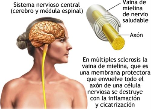 Según la Organización Mundial de la Salud (OMS), en un paciente con esclerosis múltiple el sistema inmunitario ataca a la mielina, fibra protectora que recubre las fibras nerviosas, impidiendo que el cerebro se comunique con el resto del cuerpo.