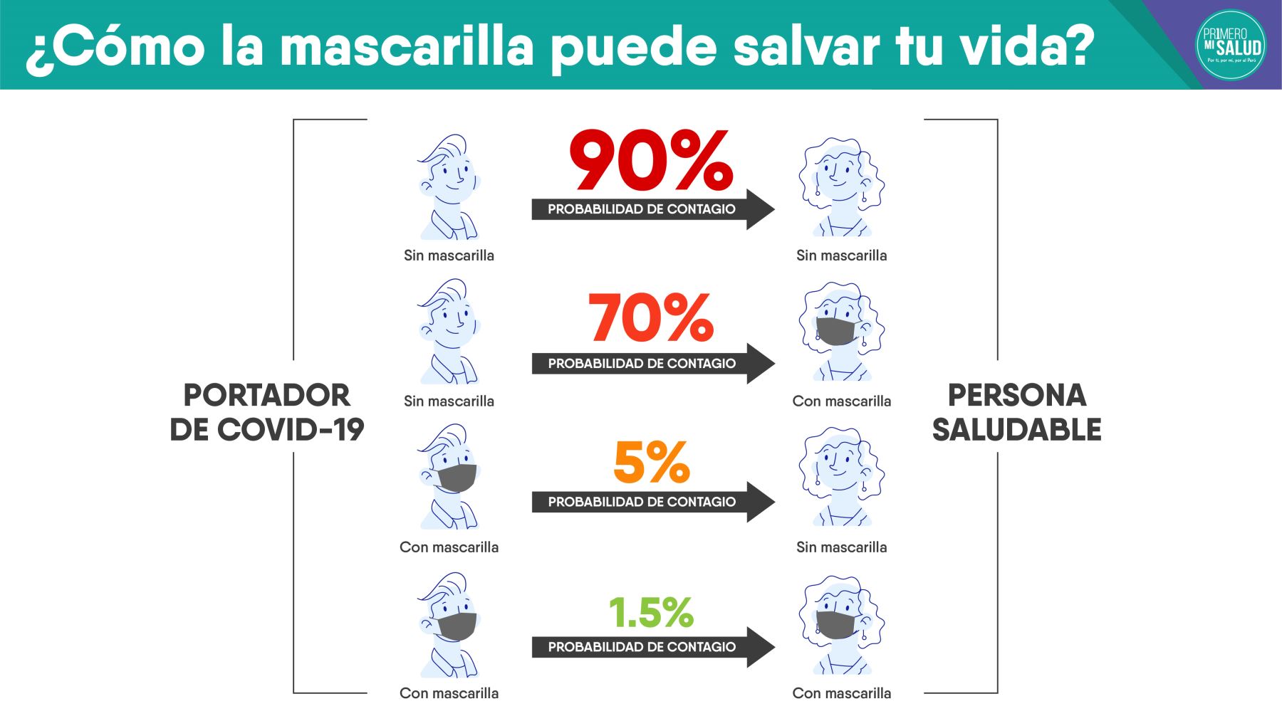 La probabilidad de contagio se minimiza y cae a 1.5% cuando no solo el portador sino la persona que está frente a él se colocan la mascarilla al salir de casa.