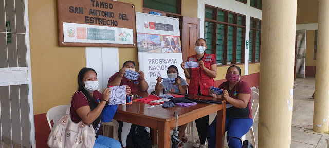 Salud en Casa.- Daysi, Melcy, Leyla y Zita viven en el Centro Poblado San Antonio del Estrecho, ubicado en la frontera con Colombia y a 15 días de navegación de la ciudad de Iquitos en Loreto. Ellas fueron convocadas por Madeleine Ramos, monitora del Programa Nacional PAIS, del Ministerio de Desarrollo e Inclusión Social (MIDIS), para aprender, en el Tambo de esa localidad, la confección de mascarillas que las protejan junto a sus familias de la propagación de la COVID-19.