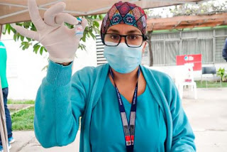 Para esta batalla cotidiana contra el feroz covid-19, la licenciada va aperchada con su traje de bioseguridad, mascarillas y careta. Carga su caja transportadora de “biológicos” (las vacunas); otra caja hermética para desechar los punzocortantes; una bolsa para los residuos biológicos y otra con los insumos indispensables (algodón, alcohol gel, bolsitas, guantes).