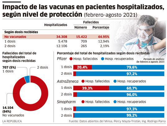 Mayta-Tristán agrega que con la vacuna Sinopharm se reporta menos fallecimientos en hospitalizados; sin embargo, aclara que dicha vacuna se aplicó en su mayoría al personal de salud, FF. AA., PNP, y en cambio Pfizer y AstraZeneca se han aplicado a los adultos mayores y personas con comorbilidades que tienen mayor riesgo de fallecer. Entonces -dice- podría ser injusto pensar que Pfizer y AstraZeneca funciona menos, “falta un análisis más específico”.